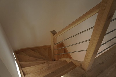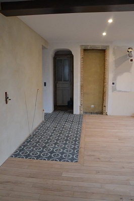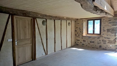 Cloison en colombage avec bois de récupération, enduit chaux, porte en chêne massif.